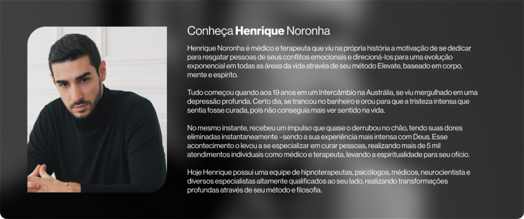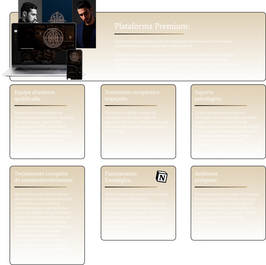 Se você já se frustrou com tratamentos que só amorteceram suas dores, investiu em mentorias que falharam no acompanhamento, te entregaram conhecimentos dispersos que não conversam com o seu atual momento ou métodos genéricos que não atendem ao seu padrão cerebral e modus operandi, o Programa Elevate é para você.